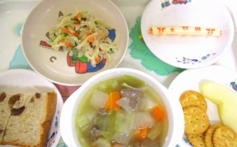 ■10時のおやつ チーズ ■おひるごはん ぶどうパン ポトフ 切り干し大根のみそマヨネーズ和え ■3時のおやつ りんご クラッカー