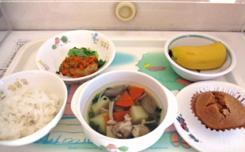 ■10時のおやつ バナナ ■おひるごはん 麦ごはん 魚のもみじ焼き サラダ菜 けんちん汁 ■3時のおやつ きな粉蒸しパン