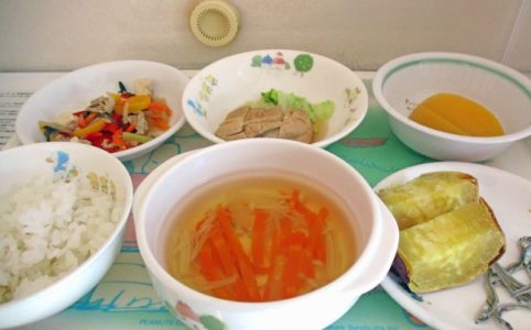 ■10時のおやつ もも ■おひるごはん 麦ごはん 清汁 鶏肉のさっぱり煮 チャプチェ レタス ■3時のおやつ 焼き芋 いりこ