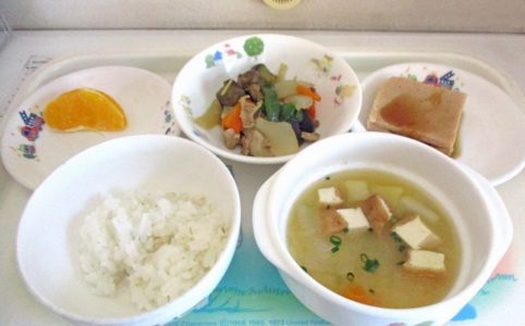 ■10時のおやつ オレンジ ■おひるごはん 麦ごはん 豚肉となすの炒めもの さつまいものみそ汁 ■3時のおやつ きな粉よせ こんぶ