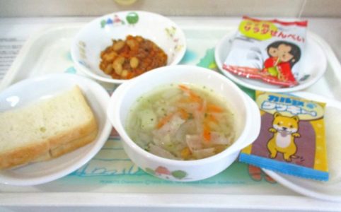 ■10時のおやつ せんべい ■おひるごはん 食パン チリコンカーン 野菜スープ ■3時のおやつ 梨 クッキー