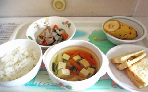 ■10時のおやつ バナナ ■おひるごはん 麦ごはん 鶏肉とさといものうま煮 清汁 ■3時のおやつ りんごのトースト