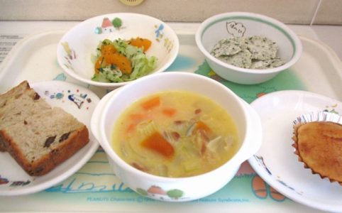 ■10時のおやつ せんべい ■おひるごはん ぶどうパン 鶏肉とかぼちゃのシチュー オレンジサラダ ■3時のおやつ バスブーサ