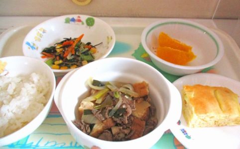 ■10時のおやつ オレンジ ■おひるごはん 十六穀米ごはん 肉豆腐 小松菜とひじきの和え物 ■3時のおやつ さつまいものバターケーキ