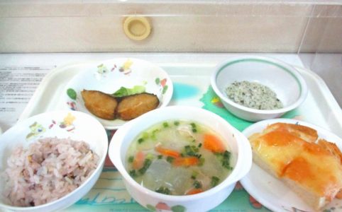 ■10時のおやつ ウエハース ■おひるごはん 麦ごはん 魚の竜田揚げ レタス かぼちゃの豆乳みそスープ ■3時のおやつ ココアゼリー こんぶ