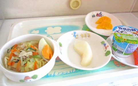 ■10時のおやつ オレンジ ■おひるごはん ラーメン すいか ■3時のおやつ ヨーグルト ビスケット