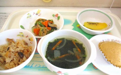 ■10時のおやつ キウイ ■おひるごはん きのこごはん がんもどきの中華風うま煮 わかめスープ ■3時のおやつ マラーカオ