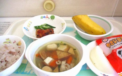 ■10時のおやつ バナナ ■おひるごはん 十六穀米ごはん 鶏の照り焼き オクラのソテー けんちん汁 ■3時のおやつ 梨 かりんとう