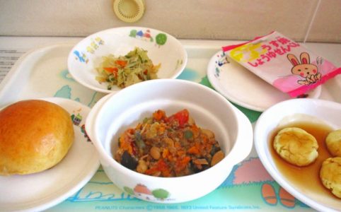 ■10時のおやつ せんべい ■おひるごはん ロールパン なすのミートソース煮 じゃこサラダ ■3時のおやつ みたらしポテト