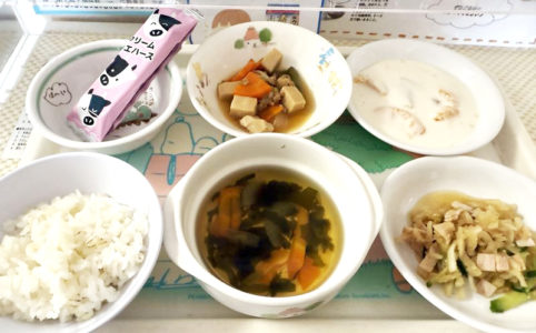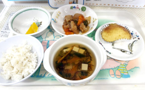 ■10時のおやつ ウエハース ■おひるごはん 麦ごはん 清汁 高野豆腐のそぼろ煮 切り干し大根のあちゃら漬け ■3時のおやつ フルーツヨーグルト