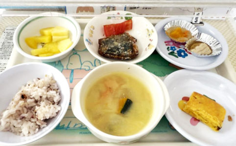 ■10時のおやつ パイン缶 ■おひるごはん 十六穀米ごはん 魚の竜田揚げ トマト かぼちゃの豆乳みそスープ ■3時のおやつ 米粉のにんじんおやき