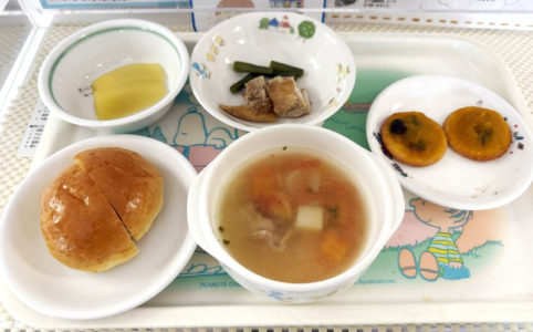■10時のおやつ チーズ ■おひるごはん 麦ごはん 豚肉の生姜焼き けんちん汁 ■3時のおやつ トマト羹