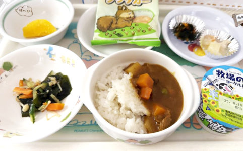 ■10時のおやつ オレンジ ■おひるごはん 麦ごはん カレー わかめのごま酢和え ■3時のおやつ ヨーグルト クラッカー