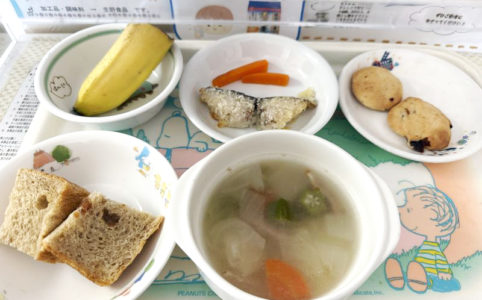 ■10時のおやつ バナナ ■おひるごはん ぶどうパン 魚のパン粉焼き にんじんの甘煮 ベーコンスープ ■3時のおやつ レーズンクッキー