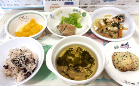 ■10時のおやつ みかん缶 ■おひるごはん 赤飯 清汁 鶏肉のさっぱり煮 サラダ菜 チャンプル ■3時のおやつ 黒ごまとチーズのクッキー いりこ