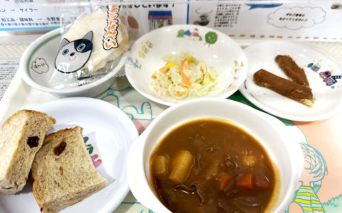 ■10時のおやつ せんべい ■おひるごはん ぶどうパン ビーフシチュー コールスロー ■3時のおやつ きなこ棒