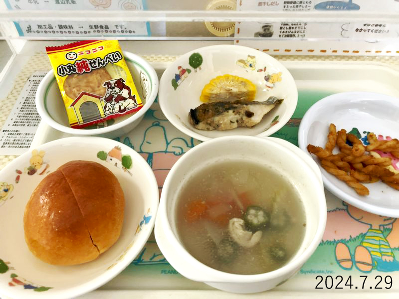 給食 2024-07-29の給食 Posted on 2024-07-29 ■10時のおやつ せんべい ■おひるごはん ロールパン 魚のごまマヨネーズ焼き ゆでとうもろこし オクラのスープ ■3時のおやつ マカロニのきな粉和え クリックして X で共有 (新しいウィンドウで開きます) X Facebook で共有するにはクリックしてください (新しいウィンドウで開きます) Facebook クリックして Tumblr で共有 (新しいウィンドウで開きます) Tumblr クリックして Pinterest で共有 (新しいウィンドウで開きます) Pinterest