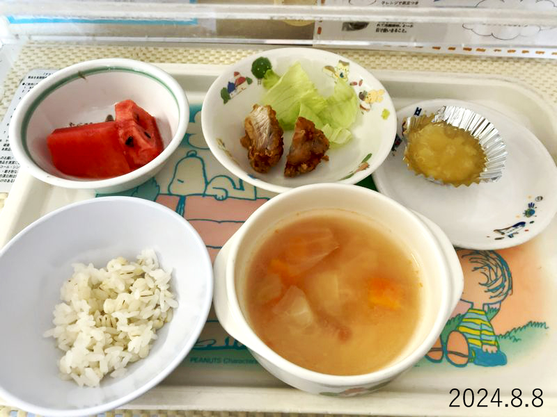 給食 2024-08-08の給食 Posted on 2024-08-08 ■10時のおやつ すいか ■おひるごはん 麦ごはん 鶏のからあげ レタス ミネストローネスープ ■3時のおやつ りんごゼリー クリックして X で共有 (新しいウィンドウで開きます) X Facebook で共有するにはクリックしてください (新しいウィンドウで開きます) Facebook クリックして Tumblr で共有 (新しいウィンドウで開きます) Tumblr クリックして Pinterest で共有 (新しいウィンドウで開きます) Pinterest
