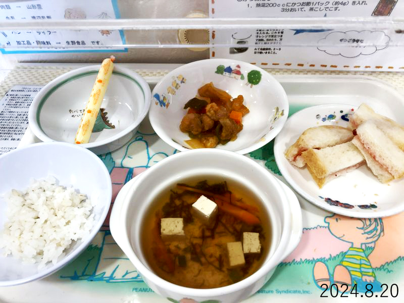 給食 2024-08-20の給食 Posted on 2024-08-20 ■10時のおやつ チーズ ■おひるごはん 麦ごはん 酢鶏 春雨サラダ ■3時のおやつ 豆腐ドーナツ いりこ クリックして X で共有 (新しいウィンドウで開きます) X Facebook で共有するにはクリックしてください (新しいウィンドウで開きます) Facebook クリックして Tumblr で共有 (新しいウィンドウで開きます) Tumblr クリックして Pinterest で共有 (新しいウィンドウで開きます) Pinterest