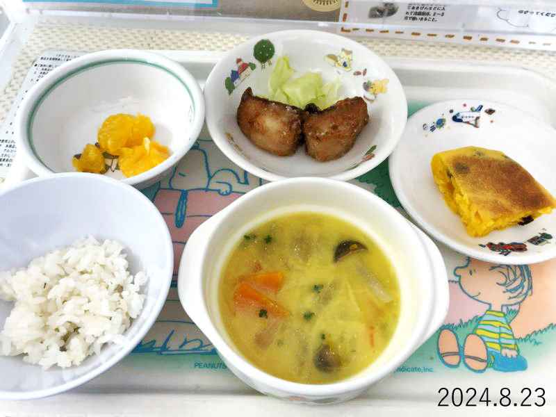 給食 2024-08-23の給食 Posted on 2024-08-23 ■10時のおやつ みかん缶 ■おひるごはん 麦ごはん 魚の竜田揚げ レタス かぼちゃの豆乳みそスープ ■3時のおやつ 米粉のにんじんおやき するめ クリックして X で共有 (新しいウィンドウで開きます) X Facebook で共有するにはクリックしてください (新しいウィンドウで開きます) Facebook クリックして Tumblr で共有 (新しいウィンドウで開きます) Tumblr クリックして Pinterest で共有 (新しいウィンドウで開きます) Pinterest
