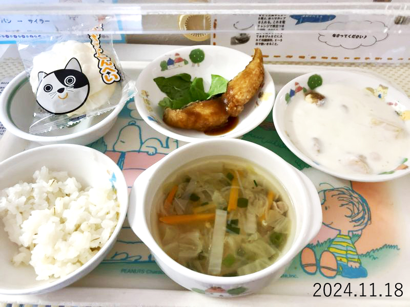 給食 2024-11-18の給食 Posted on 2024-11-18 ■10時のおやつ せんべい ■おひるごはん 麦ごはん 魚のかば焼き風 サラダ菜 白菜と春雨のスープ ■3時のおやつ フルーツヨーグルト X で共有 (新しいウィンドウで開きます) X Facebook で共有 (新しいウィンドウで開きます) Facebook Tumblr で共有 (新しいウィンドウで開きます) Tumblr Pinterest で共有 (新しいウィンドウで開きます) Pinterest