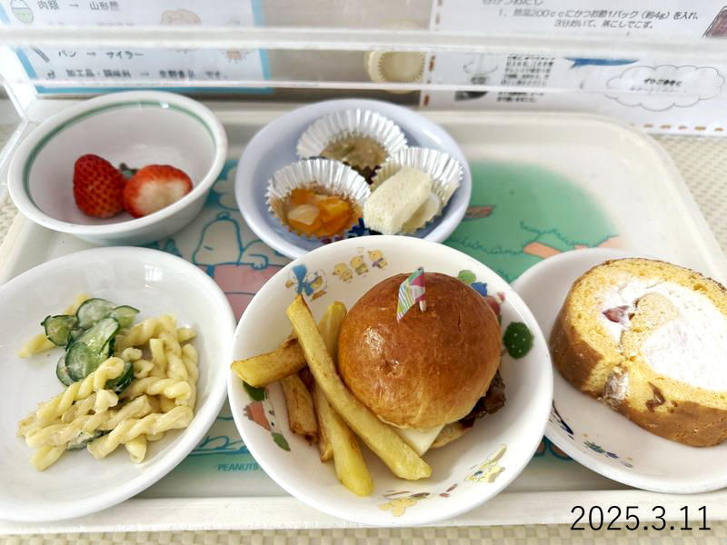 給食 2025-03-11の給食 Posted on 2025-03-11 ■10時のおやつ いちご ■おひるごはん ハンバーガー フライドポテト マカロニサラダ ■3時のおやつ ロールケーキ X で共有 (新しいウィンドウで開きます) X Facebook で共有 (新しいウィンドウで開きます) Facebook Tumblr で共有 (新しいウィンドウで開きます) Tumblr Pinterest で共有 (新しいウィンドウで開きます) Pinterest