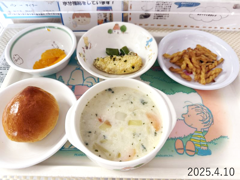 給食 2025-04-10の給食 Posted on 2025-04-10 ■10時のおやつ みかん缶 ■おひるごはん ロールパン 魚のパン粉焼き スナップえんどう キャベツとコーンの豆乳スープ ■3時のおやつ マカロニのきな粉和え X で共有 (新しいウィンドウで開きます) X Facebook で共有 (新しいウィンドウで開きます) Facebook Tumblr で共有 (新しいウィンドウで開きます) Tumblr Pinterest で共有 (新しいウィンドウで開きます) Pinterest