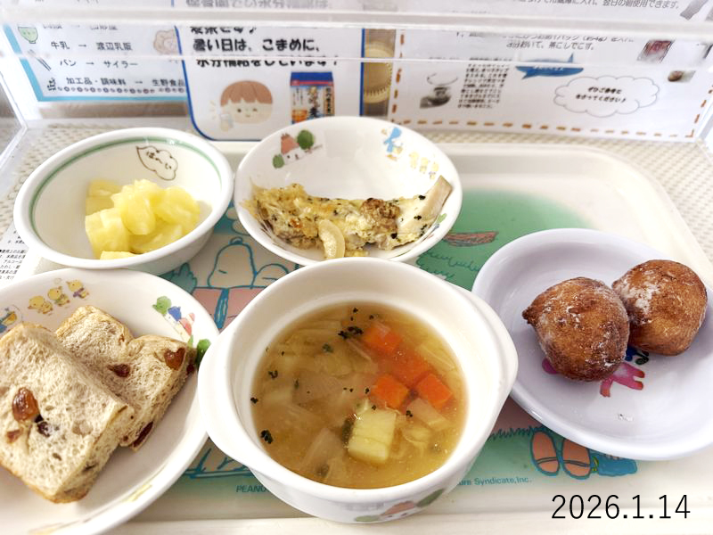 給食 2026-01-14の給食 Posted on 2026-01-14 ■10時のおやつ パイン缶 ■おひるごはん ぶどうパン 魚のマヨネーズ焼き 野菜スープ ■3時のおやつ ドーナツ いりこ クリックして X で共有 (新しいウィンドウで開きます) X Facebook で共有するにはクリックしてください (新しいウィンドウで開きます) Facebook クリックして Tumblr で共有 (新しいウィンドウで開きます) Tumblr クリックして Pinterest で共有 (新しいウィンドウで開きます) Pinterest