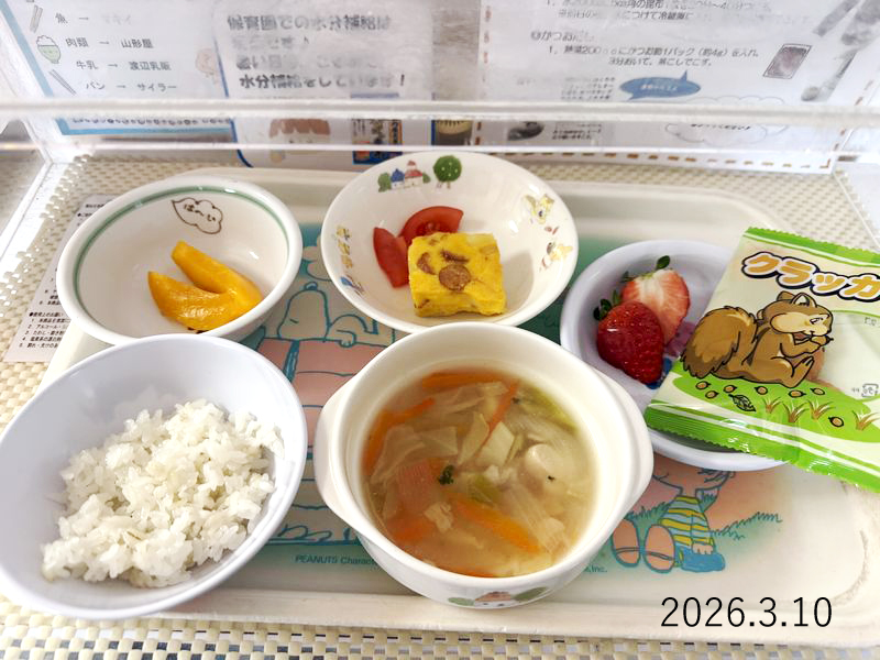 給食 2026-03-10の給食 Posted on 2026-03-10 ■10時のおやつ もも缶 ■おひるごはん 麦ごはん ウインナーのオムレット トマト チキンスープ ■3時のおやつ いちご クラッカー X で共有 (新しいウィンドウで開きます) X Facebook で共有 (新しいウィンドウで開きます) Facebook Tumblr で共有 (新しいウィンドウで開きます) Tumblr Pinterest で共有 (新しいウィンドウで開きます) Pinterest