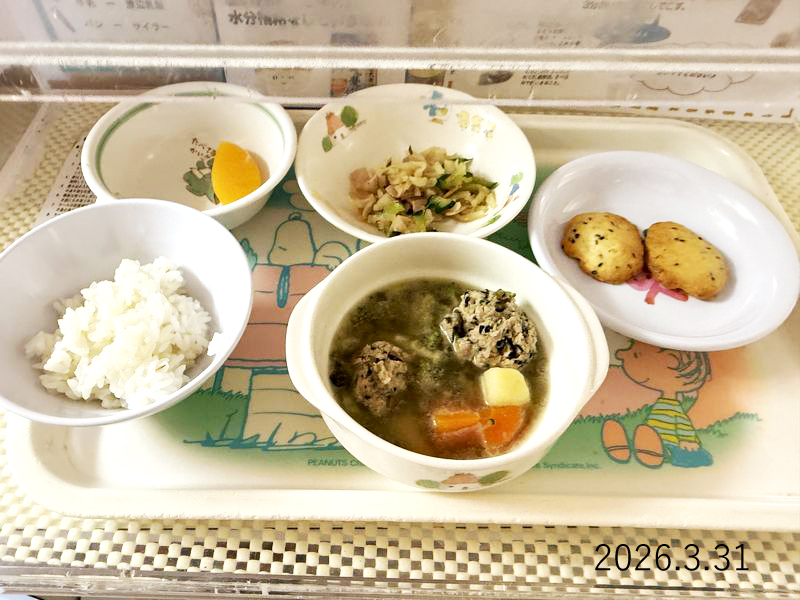 給食 2026-03-31の給食 Posted on 2026-03-31 ■10時のおやつ もも缶 ■おひるごはん 麦ごはん ひじき団子のスープ 切り干し大根の中華風サラダ ■3時のおやつ 黒ゴマとチーズのクッキー X で共有 (新しいウィンドウで開きます) X Facebook で共有 (新しいウィンドウで開きます) Facebook Tumblr で共有 (新しいウィンドウで開きます) Tumblr Pinterest で共有 (新しいウィンドウで開きます) Pinterest