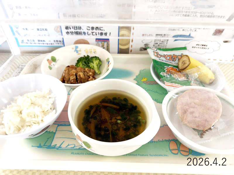 給食 2026-04-02の給食 Posted on 2026-04-02 ■10時のおやつ せんべい ■おひるごはん 麦ごはん 鶏のから揚げ ゆでブロッコリー もずくスープ ■3時のおやつ バナナ ビスケット X で共有 (新しいウィンドウで開きます) X Facebook で共有 (新しいウィンドウで開きます) Facebook Tumblr で共有 (新しいウィンドウで開きます) Tumblr Pinterest で共有 (新しいウィンドウで開きます) Pinterest