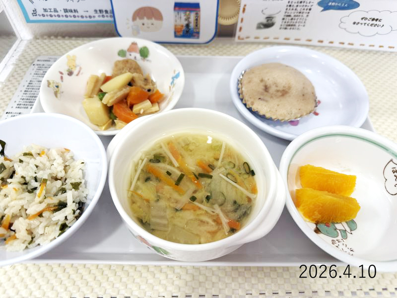 給食 2026-04-10の給食 Posted on 2026-04-10 ■10時のおやつ オレンジ ■おひるごはん わかめごはん がんもどきの炊き合わせ 大根のみそ汁 ■3時のおやつ 小倉蒸しパン X で共有 (新しいウィンドウで開きます) X Facebook で共有 (新しいウィンドウで開きます) Facebook Tumblr で共有 (新しいウィンドウで開きます) Tumblr Pinterest で共有 (新しいウィンドウで開きます) Pinterest
