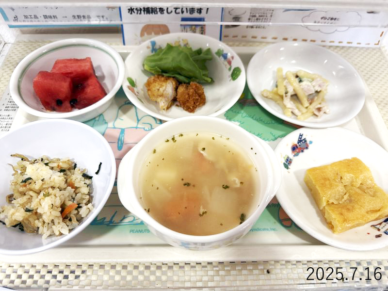 給食 2025-07-16の給食 Posted on 2025-07-16 ■10時のおやつ すいか ■おひるごはん じゃこと菜っ葉の混ぜごはん チキンカツ サラダ菜 トマトスープ マカロニとハムのサラダ ■3時のおやつ もものヨーグルトケーキ X で共有 (新しいウィンドウで開きます) X Facebook で共有 (新しいウィンドウで開きます) Facebook Tumblr で共有 (新しいウィンドウで開きます) Tumblr Pinterest で共有 (新しいウィンドウで開きます) Pinterest
