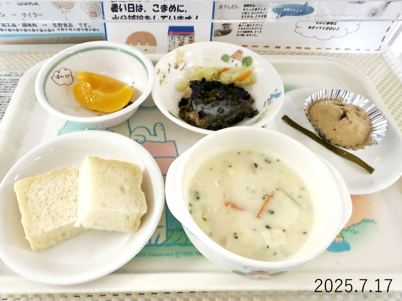 給食 2025-07-17の給食 Posted on 2025-07-17 ■10時のおやつ もも缶 ■おひるごはん 食パン 魚の香味焼き ソテー 豆乳のクリームコーンスープ ■3時のおやつ 米粉の黒糖蒸しパン こんぶ X で共有 (新しいウィンドウで開きます) X Facebook で共有 (新しいウィンドウで開きます) Facebook Tumblr で共有 (新しいウィンドウで開きます) Tumblr Pinterest で共有 (新しいウィンドウで開きます) Pinterest