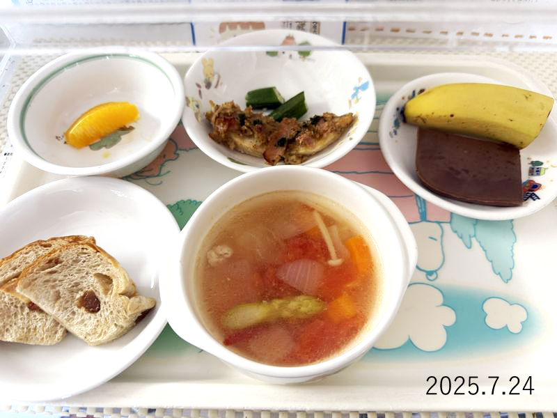 給食 2025-07-24の給食 Posted on 2025-07-24 ■10時のおやつ オレンジ ■おひるごはん ぶどうパン 魚のごまマヨネーズ焼き オクラのソテー 夏の具だくさんスープ ■3時のおやつ ココアゼリー X で共有 (新しいウィンドウで開きます) X Facebook で共有 (新しいウィンドウで開きます) Facebook Tumblr で共有 (新しいウィンドウで開きます) Tumblr Pinterest で共有 (新しいウィンドウで開きます) Pinterest
