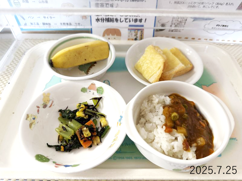 給食 2025-07-25の給食 Posted on 2025-07-25 ■10時のおやつ バナナ ■おひるごはん 麦ごはん 夏野菜のキーマカレー 小松菜とひじきの和え物 ■3時のおやつ チーズトースト X で共有 (新しいウィンドウで開きます) X Facebook で共有 (新しいウィンドウで開きます) Facebook Tumblr で共有 (新しいウィンドウで開きます) Tumblr Pinterest で共有 (新しいウィンドウで開きます) Pinterest